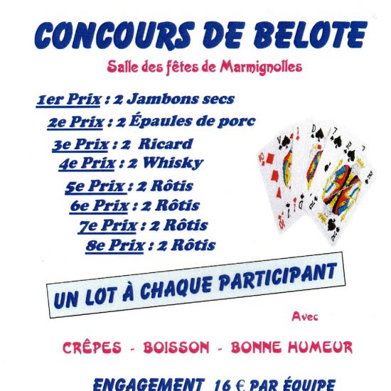 Le comité des fêtes de Désertines organise un concours de belote le dimanche 17 novembre à 14h30, salle des fêtes de Marmignolles