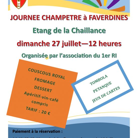 L’association du 1er régiment d’infanterie organise une journée champêtre le dimanche 27 juillet à midi à l'étang de la Chaillance sur la commune de Faverdines ; c’est dans le cher