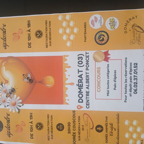 Le salon du miel organisé par le comité des fêtes se tient au centre albert poncet de Domérat le samedi 27 septembre de 10h à 19h et le dimanche 28 septembre de 10h à 18h