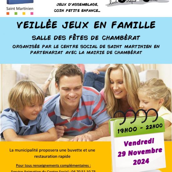 Le centre social de st martinien organise une veillée jeux en famille le vendredi 29 novembre de 19h à 22h à la salle des fêtes de Chambérat