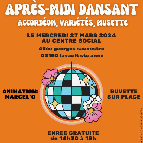 Le centre social de Lavault ste Anne organise son après midi dansant à la charité avec MARCELO le mercredi 27 mars de 14h30 à 18h.