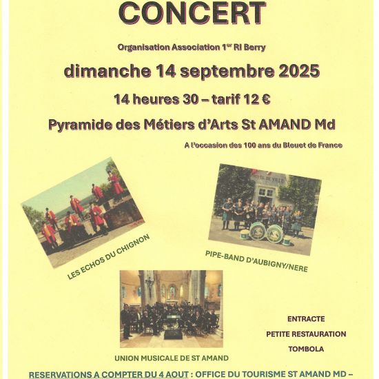 L’association du 1er régiment d’infanterie vous propose un concert à l’occasion des 100 ans du bleuet de France le dimanche 14 septembre à 14h30 à la pyramide des métiers d’art de St Amand Montrond