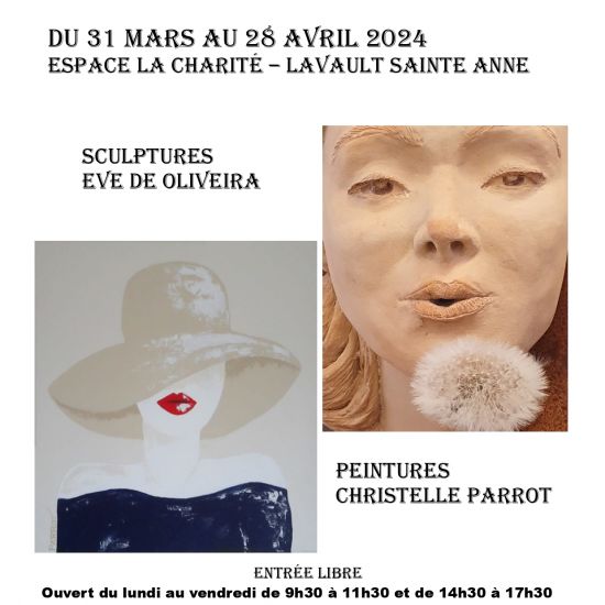 L'exposition de peintures et de sculptures "Vision féminine" de Christine Parrot et Eve De Oliveira se tient jusqu’au 28 avril 2024 au Centre Social Rural, Espace La Charité, à Lavault Ste-Anne.