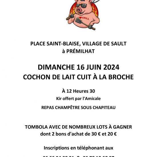 L’amicale de sault organise son repas champetre avec un COCHON DE LAIT CUIT À LA BROCHE