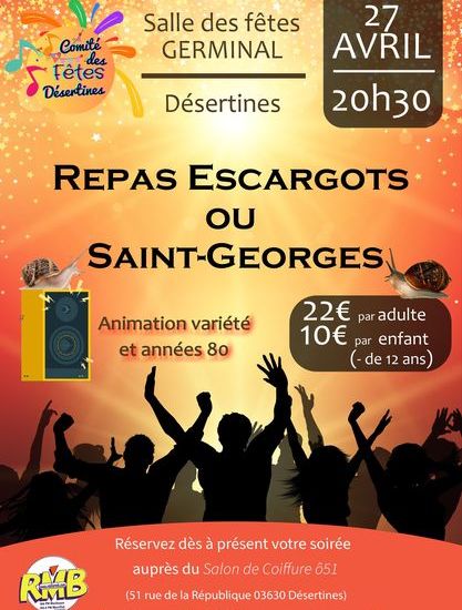 le comité des fêtes de Désertines met à l’honneur ST GEORGES en organisant son repas annuel dansant le samedi 27 avril à 20h30 à la salle germinal